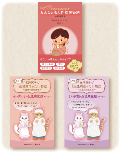 これまでの施術経験をもとに、電子書籍を数冊出版しています。いずれも「東洋医学的にはどんな原因で不調になるか・どうすれば克服できるか」を「物語」として、わかりやすく書いています。難しくなりがちな東洋医学の説明もするっと読めますので、とくに該当する症状がない方でも、楽しんで読んでいただけると思います。